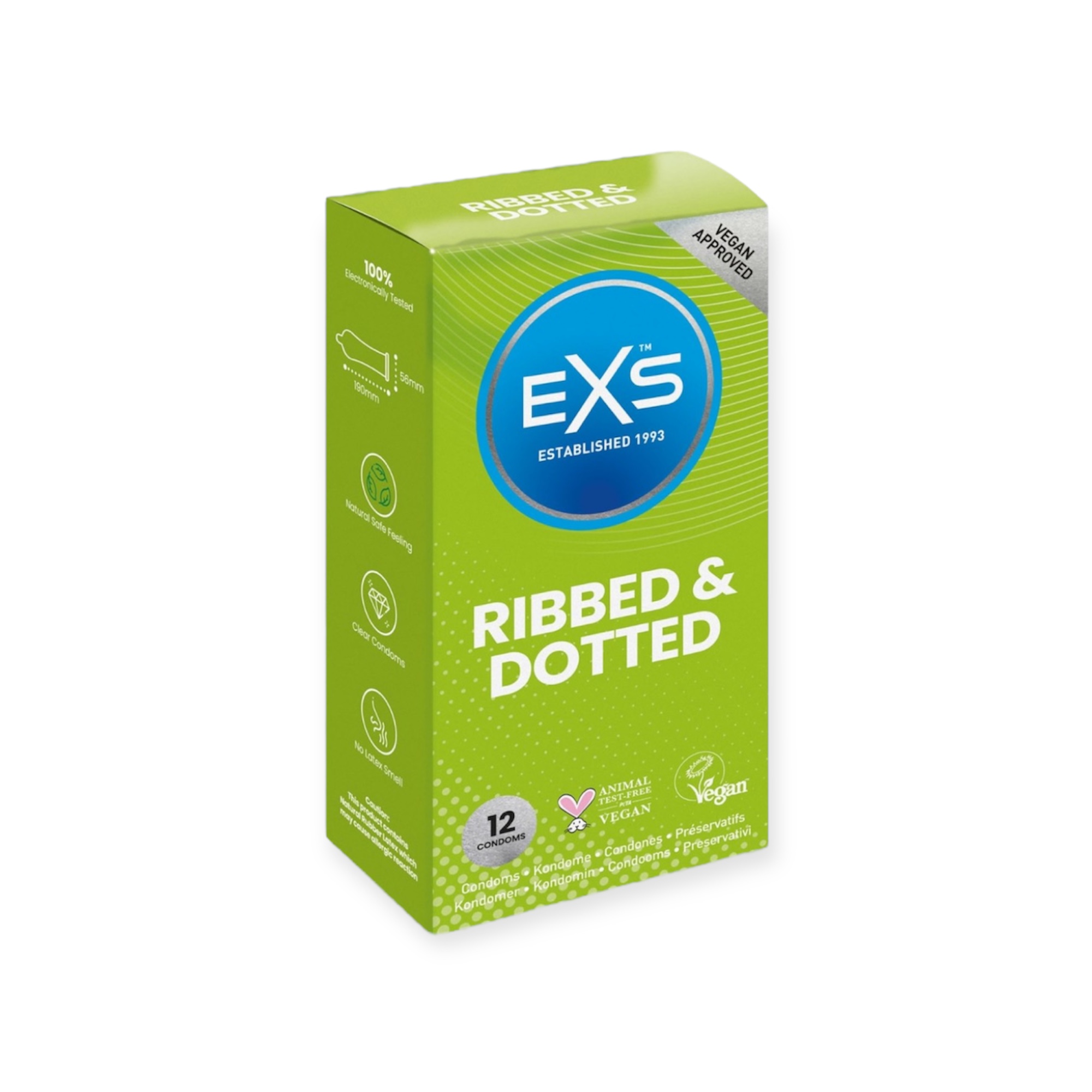 Täiusliku suurusega, et sobiks enamikule meestele, EXS Ribbed ja Dotted on 56 mm laiad ja neil on mugav laienev lutt. Need võimaldavad loomulikku liikumist ilma peenist ahendamata. Need kondoomid on valmistatud naturaalsest lateksist ja pakuvad sisemuses sileda ja siidise tunde. Sobib tundliku nahaga inimestele.
